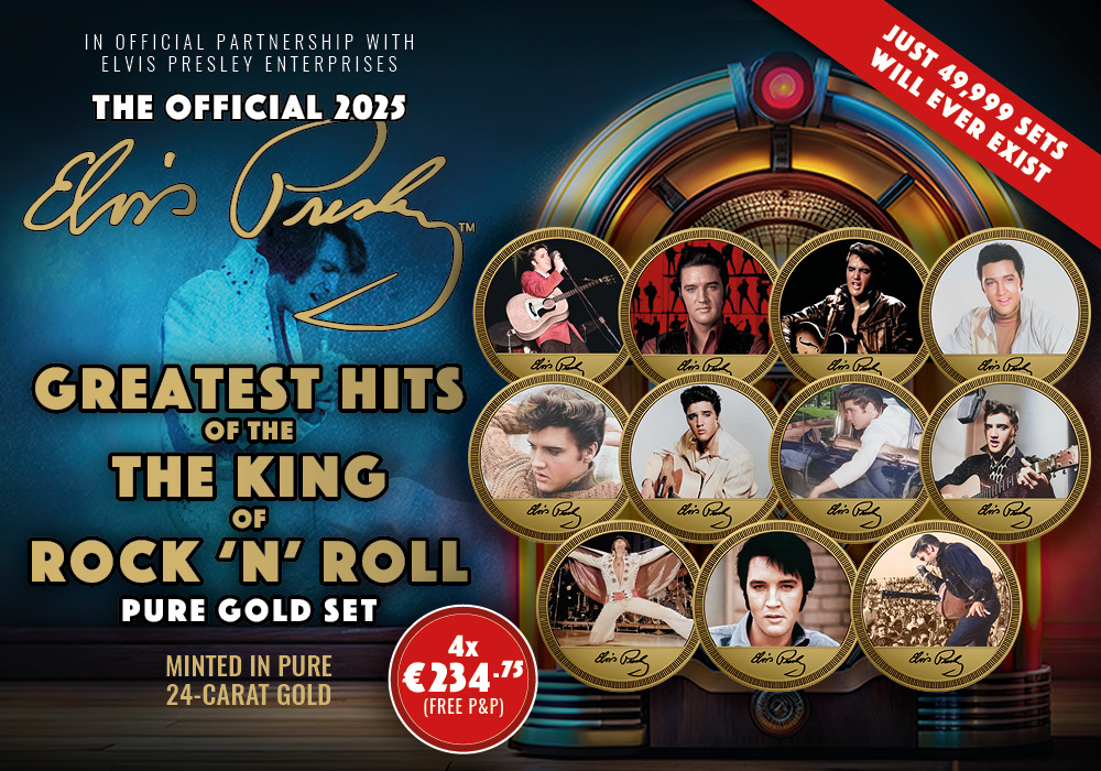 Introducing the Official Elvis Presley Greatest Hits of the King of Rock ‘n’ Roll Pure Gold Coin Set – eleven dazzling coins, each struck in pure gold and officially licensed by Elvis Presley Enterprises
